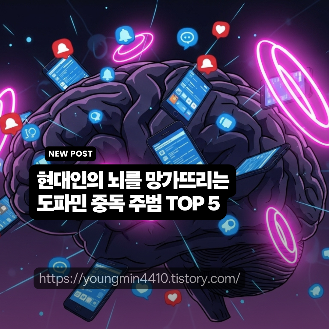 현대인의 뇌를 망가뜨리는 도파민 중독 주범 TOP 5는 숏폼 콘텐츠(집중력 47초로 추락), 인스타그램·틱톡 무한 스크롤(슬롯머신 메커니즘), 자동재생 스트리밍(수동적 소비), 소셜미디어 푸시 알림(전두엽 기능 저하), 온라인 쇼핑 무한 스크롤 순입니다.